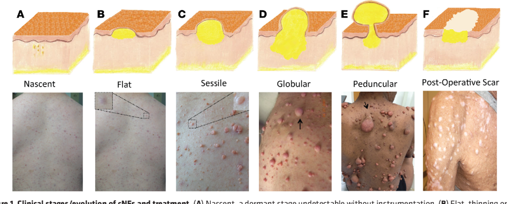 Συμπερασματικά, τα συμπτώματα και τα σημεία είναι ανωμαλίες του δέρματος café-au-lait κηλίδες, νευρινώματα, Lisch οζίδια, και φακίδες στη μασχάλη και στη βουβωνική χώρα, και συχνά είναι εμφανή κατά τη γέννηση ή λίγο αργότερα και σχεδόν πάντα από τη στιγμή που ένα παιδί γίνεται 10 ετών.