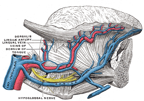 Η γλωσσική αρτηρία παρέχει αίμα προς τη γλώσσα. Ένας κλάδος της εξωτερικής καρωτιδικής αρτηρίας, προκύπτει στο επίπεδο του υοειδούς, όπου, κινείται προς τα εμπρός για να πορευτεί βαθιά στον υπογλώσσιο μυ. Σε αυτό το σημείο, δίνει διάφορους κλάδους στην ομόπλευρη γλώσσα και γίνεται αναστόμωση με την αντίπλευρη αρτηρία στην άκρη της γλώσσας. Ένα πλέγμα φλεβών ακολουθεί την αρτηρία και η κύρια γλωσσική φλέβα καταλήγει στην εσωτερική σφαγίτιδα φλέβα.