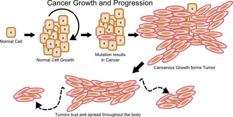 Σήμερα πιστεύεται, ότι οι περισσότεροι καρκίνοι ξεκινούν από την απώλεια ελέγχου ενός και μόνο κυττάρου. Το κύτταρο αυτό πολλαπλασιάζεται και δίνει μια ομάδα κυττάρων, των οποίων η αύξηση δεν ελέγχεται, γιατί η ισορροπία μεταξύ κυτταρικής διαίρεσης και φυσιολογικού θανάτου έχει διαταραχθεί. Ανάλογα με τον τύπο του καρκινικού κυττάρου, σε μερικές εβδομάδες, μήνες ή χρόνια, σχηματίζεται μια μεγάλη μάζα κυττάρων τοπικά ή και με πιθανές τοπικές διηθήσεις ή και με απομακρυσμένες μεταστάσεις και η εμφάνιση αυτών θα προκαλέσει σημαντικά ζωτικά προβλήματα στον οργανισμό. Ο οργανισμός δε μπορεί να αντιμετωπίσει εύκολα τα καρκινικά κύτταρα, επειδή μοιάζουν με τα φυσιολογικά, δεν ενεργοποιούν το ανοσοποιητικό σύστημα και έτσι συνεχίζεται ανεμπόδιστα η εισβολή και η εξάπλωση τους.