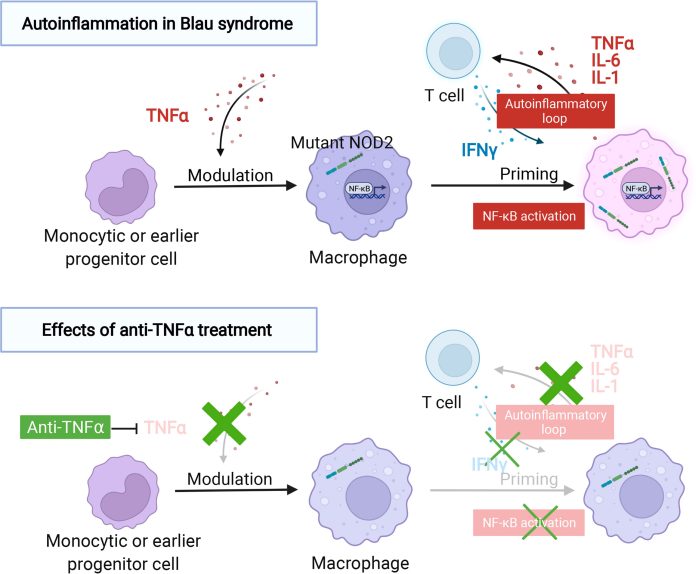 Στις NOD2/nucleotide binding oligomerization domain containing 2/Περιοχή ολιγομερισμού δέσμευσης νουκλεοτιδίων που περιέχει 2 γονιδιακές μεταλλάξεις που προκαλούν το σύνδρομο Blau η πρωτεΐνη είναι υπερδραστήρια και μπορεί να προκαλέσει μια ανώμαλη φλεγμονώδη αντίδραση.