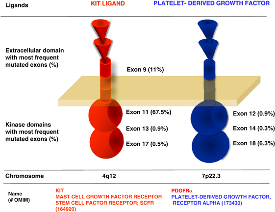 Το C-kit ανευρίσκεται σε πολλούς φυσιολογικούς ιστούς και διαδραματίζει σπουδαίο ρόλο στην αιμοποίηση, μελανινογένεση, σπερματογένεση και κινητικότητα του γαστρεντερικού σωλήνα. Η ενεργοποίηση αυτού του υποδοχέα σε φυσιολογικές συνθήκες πραγματοποιείται με τον διμερισμό του μετά την πρόσδεση του SCF/Stem cell factor και έχει δράση αντιαποπτωτική και αναγεννητική, και στους όγκους GISTs πραγματοποιείται χωρίς τον διμερισμό του, εξαιτίας μεταλλάξεων που επιτυγχάνουν μόνιμη ενεργοποίηση του kit. Οι συχνότερες μεταλλάξεις (67,50%) συμβαίνουν στο εξώνιο 11 που κωδικοποιεί το ενδοκυττάριο παραμεμβρανικό τμήμα της πρωτεϊνης. Ένας δεύτερος τύπος μεταλλάξεων ρυθμιστικού τύπου συμβαίνουν στο εξώνιο 9 που κωδικοποιεί το εξωκυττάριο τμήμα της πρωτεϊνης (11%) και στα εξώνια 13 (1%) και 17 (0,5%) που κωδικοποιούν τους ενδοκυττάριους επιτόπους ενζυματικής δράσης τυροσινικής κινάσης.