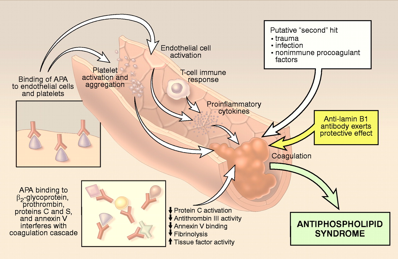 Τα Αντι-ApoH/αντισώματα κατά της απολιποπρωτεΐνης H και τα αντικαρδιολιπινικά αντισώματα δεσμεύονται και αναστέλλεται η πρωτεΐνη C, μία γλυκοπρωτεΐνη με ρυθμιστική λειτουργία στην κοινή οδό της πήξης. Τα αντισώματα τα αντιπηκτικά του Λύκου συνδέονται με την προθρομβίνη, αυξάνοντας έτσι τη διάσπαση σε θρομβίνη, που είναι η δραστική μορφή της. Σε αντιφωσφολιπιδικό σύνδρομο υπάρχουν, επίσης, αντισώματα που δεσμεύονται από την πρωτεΐνη S, η οποία είναι ένας συνπαράγοντας της πρωτεΐνης C. Έτσι, τα αντισώματα κατά της πρωτεΐνης S μειώνουν την αποτελεσματικότητα της πρωτεΐνης C. Η αννεξίνη Α5 σχηματίζει μια ασπίδα γύρω από τα αρνητικώς φορτισμένα μόρια φωσφολιπιδίων, μειώνοντας έτσι τη διαθεσιμότητά τους για την πήξη. Οι ασθενείς με αντισώματα αντιπηκτικά λύκου και μέτρια ή υψηλά αντικαρδιολιπινικά αντισώματα έχουν μεγαλύτερο κίνδυνο θρόμβωσης.