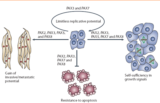 Στο κυψελιδικό ραβδομυοσάρκωμα, t(2;13)(q35;q14) και t(1;13)(p36;q14) οι μεταθέσεις επαναδιοργανώνουν τα PAX3 και PAX7, που είναι μέλη της οικογένειας των ζευγών των μεταγραφικών παραγόντων που συντήκουν αυτά τα γονίδια με το FKHR, που είναι μέλος της οικογένειας των παραγόντων που μοιάζουν με το κεφάλι πιρουνιού. Τα προκύπτοντα PAX3-FKHR/fusion protein resulting from a specific chromosomal translocation, most commonly found in alveolar rhabdomyosarcoma3/πρωτεΐνη σύντηξης που προκύπτει από μια συγκεκριμένη χρωμοσωμική μετατόπιση, η οποία συναντάται συχνότερα στο κυψελιδικό ραβδομυοσάρκωμα3 και PAX4-FKHR χιμαιρικά γονίδια κωδικοποιούν πρωτεΐνες που με το τμήμα της δέσμευσης του DNA του PAX3/PAX7 και το τμήμα ενεργοποίησης της μεταγραφής του FKHR, ενεργοποιούν τη μεταγραφή στα τμήματα δέσμευσης των PAX με υψηλότερη ικανότητα από ότι οι ανταποκρινόμενες wild-type πρωτεΐνες PAX.