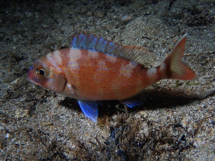 Ψάρι με πορτοκαλοκίτρινες και κοκκινωπές ανταύγιες και κατάλευκο κρέας.