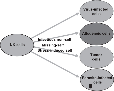 Τα κύτταρα φυσικοί φονείς (natural killer NK cells) είναι ένας σχετικά μικρός πληθυσμός (< από 10%) κυκλοφορούντων λεμφοκυττάρων που είναι διαφορετικά από τα Τ και Β λεμφοκύτταρα. Αυτά είναι μέρος της φυσικής άμυνας του οργανισμού που δεν απαιτούν προσκόληση του ξενιστή ή ανοσοποίηση για να δράσουν εναντίον των καρκινικών κυττάρων και των μολυσμένων κυττάρων με ιούς. Σε αντίθεση με τα Τ κύτταρα δεν υπάρχει κομμάτι μνήμης για την ανταπόκριση των φυσικών φονιάδων μετά την επανέκθεση του ξενιστή σε ένα διεγερτικό στόχο (καρκινικό κύτταρα, ιός). Δηλαδή, σε αντίθεση με τα Τ κύτταρα τα natural killer NK cells δεν απαιτούν αναγνώριση από τα μόρια του MHC (μείζον σύστημα ιστοσυμβατότητας) για να σκοτώσουν τα καρκινικά κύτταρα και να προκληθεί λύση του όγκου. Τα μόρια της τάξεως I MHC, βέβαια στέλνουν ένα αρνητικό ρυθμιστικό σήμα μέσω υποδοχέων στα natural killer NK cells κι έτσι αναστέλλεται η λυτική τους λειτουργία. Έτσι η απώλεια των HLAs (Human Leukocyte Antigen) από τα καρκινικά κύτταρα μπορεί να έχει σαν αποτέλεσμα την θανάτωση των κυττάρων, που στην αντίθετη περίπτωση θα διέφευγαν την ανοσοποιητική αναγνώριση από τα Τ κύτταρα.