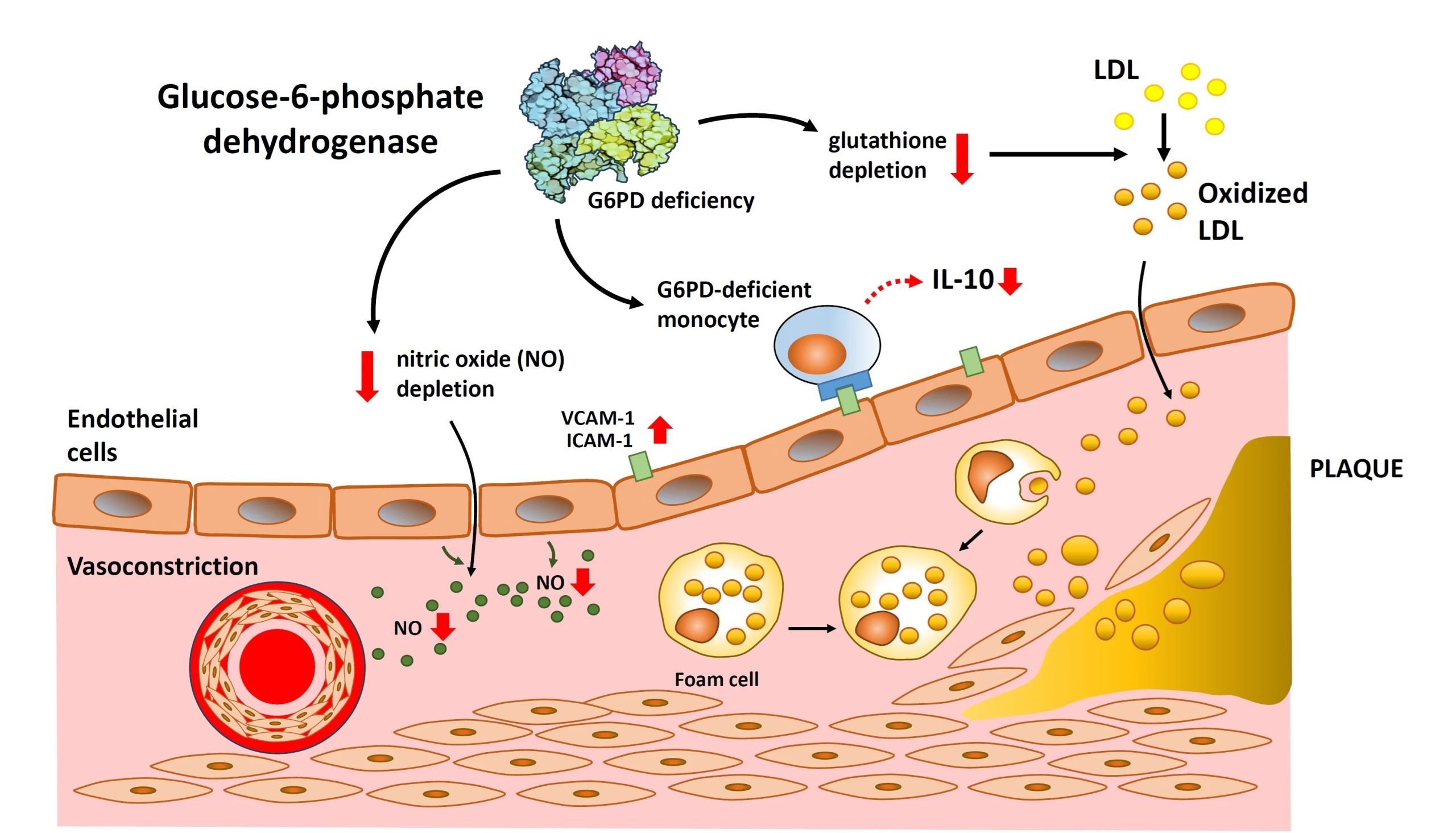 Η ανεπάρκεια του ενζύμου G6PD προκαλεί και τη συσσώρευση της γλυκόζης και έτσι υπάρχει μια αύξηση των τελικών προϊόντων προχωρημένης γλυκοζυλίωσης. Η ανεπάρκεια μειώνει επίσης την ποσότητα του NADPH, η οποία απαιτείται για το σχηματισμό του νιτρικού οξειδίου. Ο υψηλός επιπολασμός του σακχαρώδη διαβήτη τύπου 2 και η υπέρταση θα μπορούσε να σχετίζεται άμεσα με την επίπτωση της ανεπάρκειας G6PD στους πληθυσμούς αυτούς.