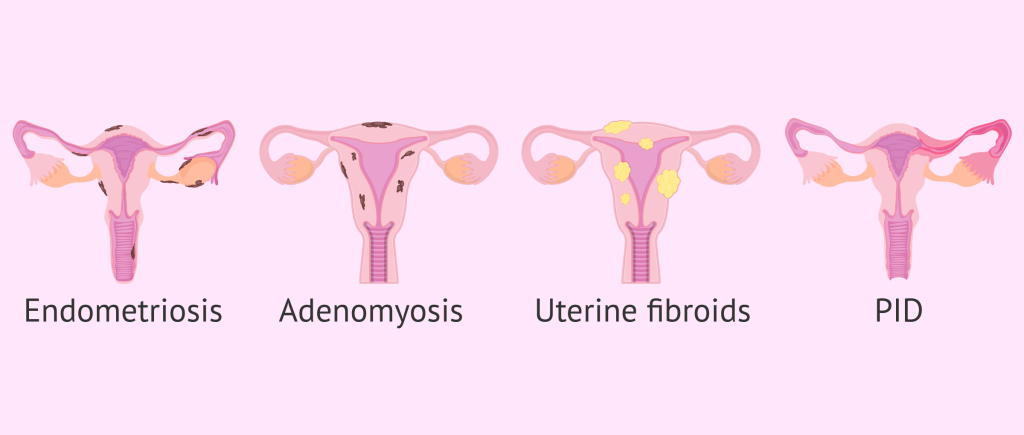 -Συγγενείς ανωμαλίες της ανατομίας της μήτρας και του κόλπου, λοίμωξη πυέλου, αδενομύωση, ενδομητρίωση και όγκοι πυέλου, όπως λειομυώματα.