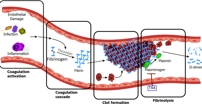 D-dimers. Τα προϊόντα διάσπασης του ινώδους είναι θραύσματα πρωτεΐνης που υπάρχουν στο αίμα όταν ο θρόμβος αποικοδομείται με ινωδόλυση