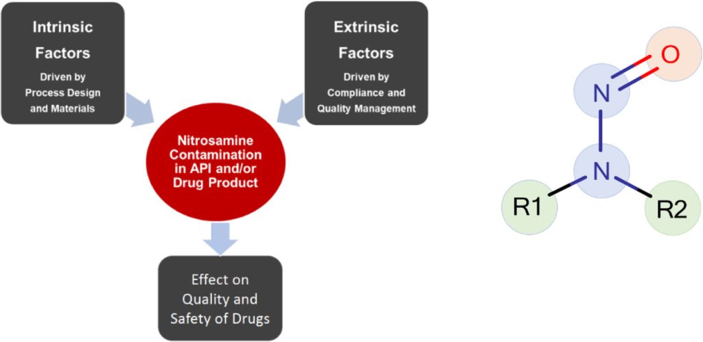 Οι νιτροζαμίνες σχηματίζονται εύκολα στην πεπτική οδό από αμίνες και νιτρώδη άλατα, που και τα δύο υπάρχουν στις τροφές, τα φάρμακα, τα καλλυντικά και το περιβάλλον.