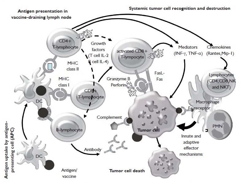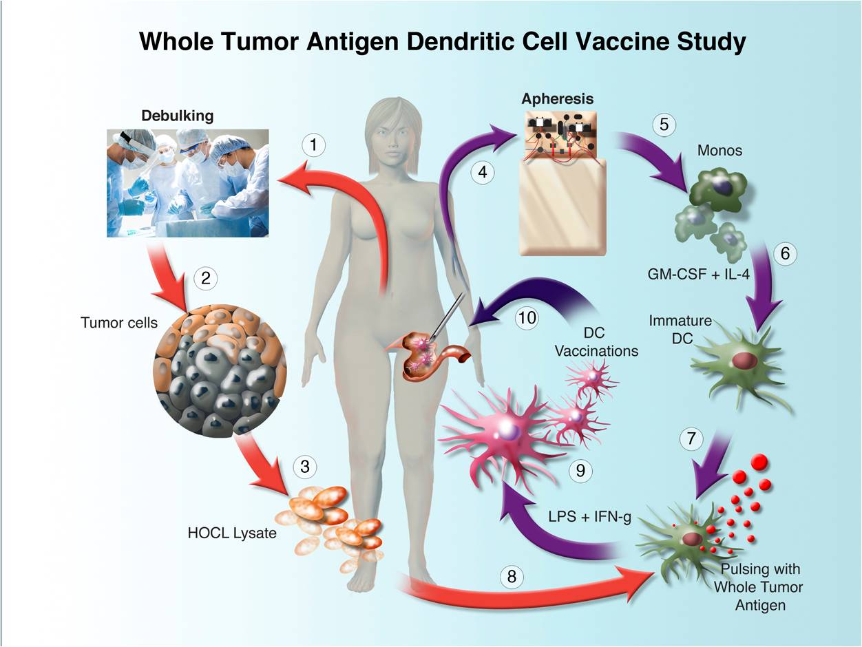 Τα εμβόλια από κύτταρα είναι είτε αυτόλογα είτε αλλογενή στην προέλευση. Παρά το ότι οι αυτόλογοι όγκοι έχουν ερευνηθεί σαν πηγή αντιγόνων για ανοσοποίηση, η χρήση τους περιορίστηκε από την μεγαλύτερη αποτελεσματικότητα των δενδριτικών κυττάρων που είναι ένα συχνό μονοπάτι για την διέγερση των T κυττάρων. Η κλινική χρησιμότητα των εμβολίων από δενδριτικά κύτταρα αρχικά ήταν περιορισμένη λόγω του αριθμού των κυττάρων, αλλά αυτό το πρόβλημα ξεπεράστηκε δημιουργώντας κύτταρα ex vivo με τη χρήση κυτοκινών. Τα μονοκύτταρα στο περιφερικό αίμα είτε προσκολλημένα στο πλαστικό ή διαλεγμένα για τα CD14 επωάζονται σε μέσο καλλιέργειας που περιέχει αυξητικούς παράγοντες λευκών GM-CSF και IL-4 ή GM-CSF και IL-3 και δημιουργούνται δενδριτικά κύτταρα που μπορεί να χρησιμοποιηθούν για την παρασκευή ενός εμβολίου. Ενδοδερμική, υποδόρια και σε μερικές περιπτώσεις ενδολεμφική χορήγηση του εμβολίου γίνεται και όλες οι μέθοδοι είναι αποτελεσματικές και έχουν ως στόχο τα δενδριτικά κύτταρα να συναντήσουν τα Τ κύτταρα. Η ανοσοποίηση με δενδριτικά κύτταρα είναι ασφαλής και εύκολη και χωρίς παρενέργειες. Συνήθως, οι ανταποκρίσεις του ανοσοποιητικού είναι σε χαμηλά επίπεδα αν και πλήρεις ανταποκρίσεις μπορεί να επιτευχθούν.