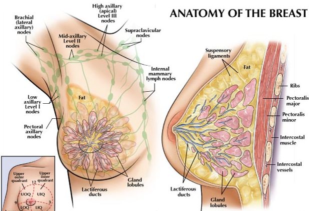 –Οι μαστοί της ενήλικης γυναίκας εκτείνονται από την 2η έως την 6η πλευρά και από το στέρνο μέχρι την πρόσθια ή τη μέση μασχαλιαία γραμμή.