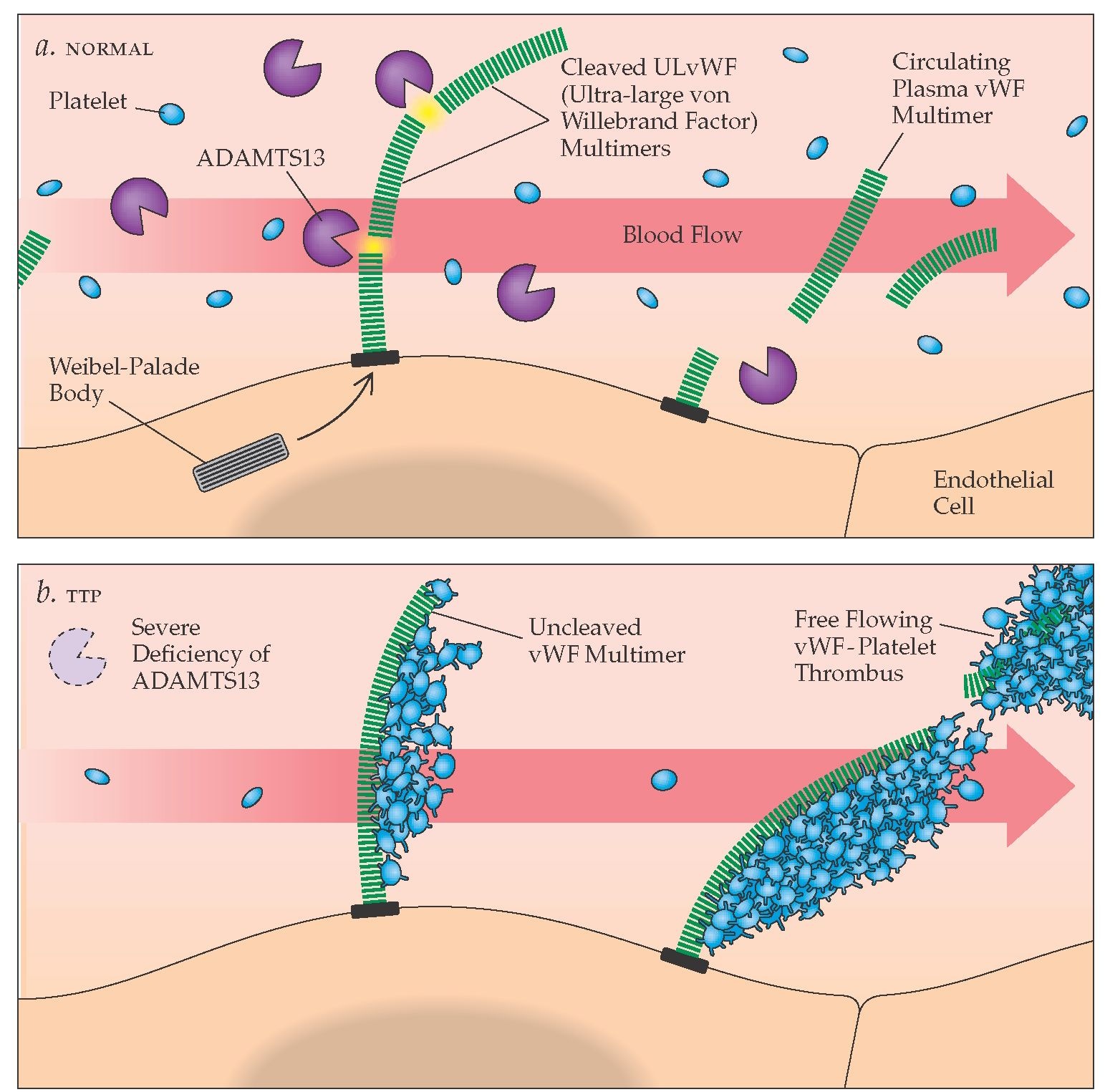 Η ιδιοπαθής μορφή θρομβωτική θρομβοπενική πορφύρα πρόσφατα συνδέεται με την αναστολή του ενζύμου ADAMTS13 από αντισώματα, καθιστώντας την μία αυτοάνοση νόσο. Η ADAMTS13 είναι μια μεταλλοπρωτεϊνάση υπεύθυνη για την κατανομή του παράγοντα νοη Willebrand (vWF), μια πρωτεΐνη που συνδέει τα αιμοπετάλια, τους θρόμβους αίματος, και το τοίχωμα των αιμοφόρων αγγείων κατά τη διαδικασία της πήξης του αίματος. Πολύ μεγάλα πολυμερή vWF είναι πιο επιρρεπή να οδηγήσουν σε πήξη. Ως εκ τούτου, χωρίς την κατάλληλη διάσπαση του vWF με την ADAMTS13, η πήξη λαμβάνει χώρα σε υψηλότερο ποσοστό, ειδικά στο μικροαγγειακό σύστημα που είναι μέρος του συστήματος των αιμοφόρων αγγείων, όπου ο vWF είναι περισσότερο ενεργός λόγω του μεγάλου στρες διάτμησης.