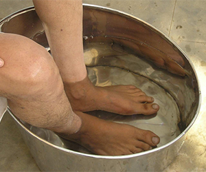 Στο παραπάνω μείγμα σε 3 κουταλιές της σούπας, προσθέστε 3 λίτρα νερό με θερμοκρασία 40ο C και κάντε το ποδόλουτρο.