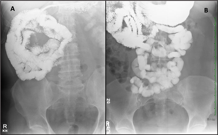 Το λεπτό έντερο διερευνάται με διάβαση, με εσωτερική λήψη βαρίου, με την εντερόκλυση και δια της παλινδρόμου πληρώσεως του τελικού ειλεού.