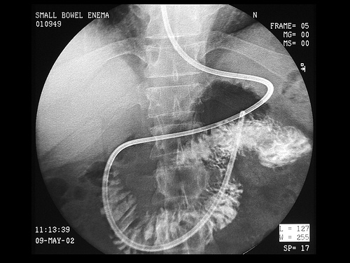 Η απεικόνιση του αυλού του λεπτού εντέρου γίνεται κατόπιν χορηγήσεως διαλύματος βαρίου. Το βάριο που χρησιμοποιείται για την εξέταση του λεπτού εντέρου θα πρέπει να μην κροκυδώνεται εύκολα και να επαλείφει ομαλά τον αυλό του λεπτού εντέρου.