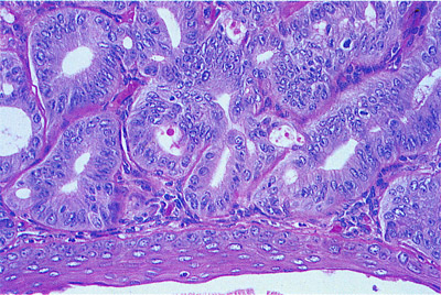 Αδενοκαρκίνωμα κόλπου. Κατά την επισκόπηση η αδένωση εμφανίζεται σαν μια λεπτή, ερυθρά υπέγερση αδενικού τύπου.