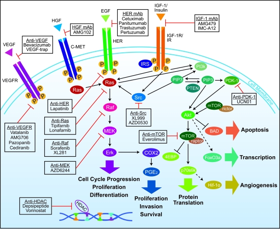 - Erlotinib (Tarceva ), αναστέλλει τον υποδοχέα του επιδερμικού αυξητικού παράγοντα, και λειτουργεί μέσω ενός παρόμοιου μηχανισμού, όπως και η Gefitinib. Η erlotinib έχει δειχθεί ότι αυξάνει την επιβίωση σε μεταστατικό μη μικροκυτταρικό καρκίνο του πνεύμονα, όταν χρησιμοποιείται ως θεραπεία δεύτερης γραμμής, αλλά μπορεί να χρησιμοποιηθεί σε όλους τους όγκους, ανάλογα με το μοριακό προφίλ του όγκου.