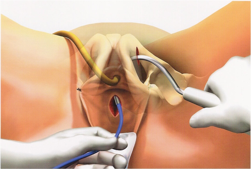 Μια μικρή χειρουργική τομή γίνεται μέσα στον κόλπο και δύο μικρές τομές στην κοιλιά ακριβώς πάνω από την ηβική γραμμή.