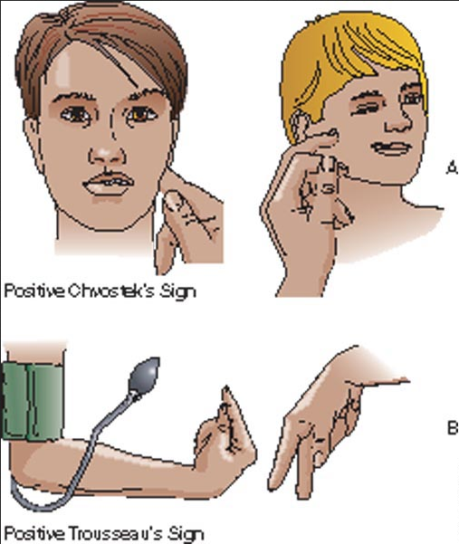 Τα συμπτώματα της υπασβεστιαμίας είναι νευρομυϊκή ευερεθιστότητα, αδυναμία, απώλεια βάρους, διάρροια, κοιλιακές κράμπες, οστικοί πόνοι, παραισθησίες, κεφαλαλγία, σπασμοί, ξηρό δέρμα και σημεία Chvostek και Trousseau. Σημείο Trousseau (καρπικός σπασμός – χέρι μαιευτήρα μετά από διόγκωση της περιχειρίδας πάνω από τη συστολική πίεση) και Σημείο Chvostek (μετά από πλήξη του προσωπικού νεύρου βλέπουμε σπασμούς στο πρόσωπο).