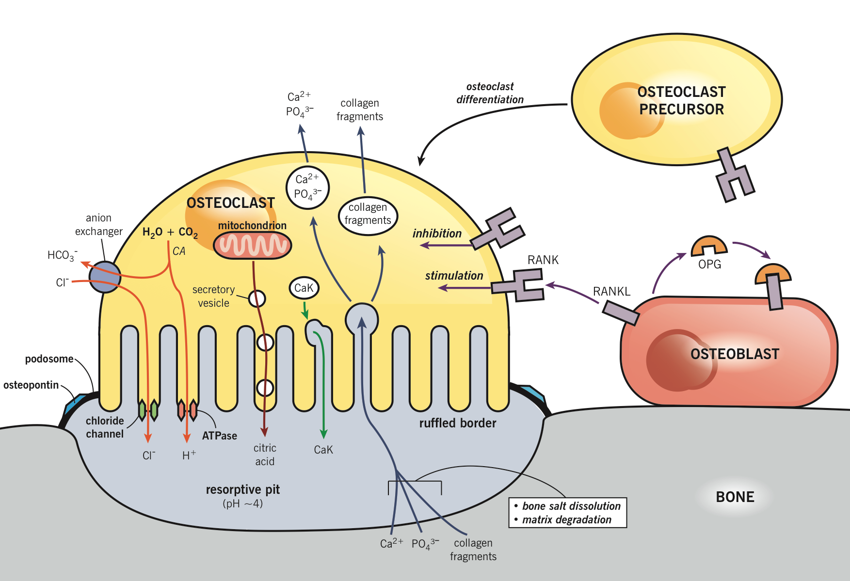 Στα οστά, η ΡΤΗ ενισχύει την απελευθέρωση ασβεστίου από τις αποθήκες που περιέχονται στα οστά. Η οστική απορρόφηση είναι η φυσιολογική καταστροφή του οστού από τους οστεοκλάστες, οι οποίοι διεγείρονται έμμεσα από την PTH. Η διέγερση είναι έμμεση, καθώς οι οστεοκλάστες δεν έχουν υποδοχέα για την ΡΤΗ. μάλλον, η ΡΤΗ δεσμεύεται με τους οστεοβλάστες, τα κύτταρα που είναι υπεύθυνα για τη δημιουργία οστού. Η δέσμευση διεγείρει τους οστεοβλάστες για να αυξήσει την έκφραση του RANKL και αναστέλλει την έκκριση της Οστεοπροτεγερίνης (OPG). Η ελεύθερη OPG δεσμεύεται ανταγωνιστικά με τον RANKL ως υποδοχέας, εμποδίζοντας την αλληλεπίδραση του RANKL με τον RANK, έναν δέκτη για τον RANKL. Η δέσμευση του RANKL στον RANK (διευκολυνόμενη από τη μειωμένη ποσότητα OPG που είναι διαθέσιμη για τη δέσμευση της περίσσειας RANKL) διεγείρει αυτούς τους προδρόμους οστεοκλαστών να συντηχθούν σχηματίζοντας νέους οστεοκλάστες, πράγμα που τελικά ενισχύει την οστική απορρόφηση. Ένας άλλος μηχανισμός για τη ρύθμιση αυτών των οδών, όπως η PTH, είναι από τα οιστρογόνα. Τα οιστρογόνα καταστέλλουν την παραγωγή Τ κυττάρων, ρυθμίζοντας τη διαφοροποίηση και τη δραστηριότητα των Τ κυττάρων στον μυελό των οστών, το θύμο αδένα και τα περιφερειακά λεμφοειδή όργανα. Στο μυελό των οστών, τα οιστρογόνα καθορίζουν προς τα κάτω τον πολλαπλασιασμό των αιμοποιητικών βλαστοκυττάρων μέσω ενός εξαρτώμενου από την IL-7 μηχανισμού.